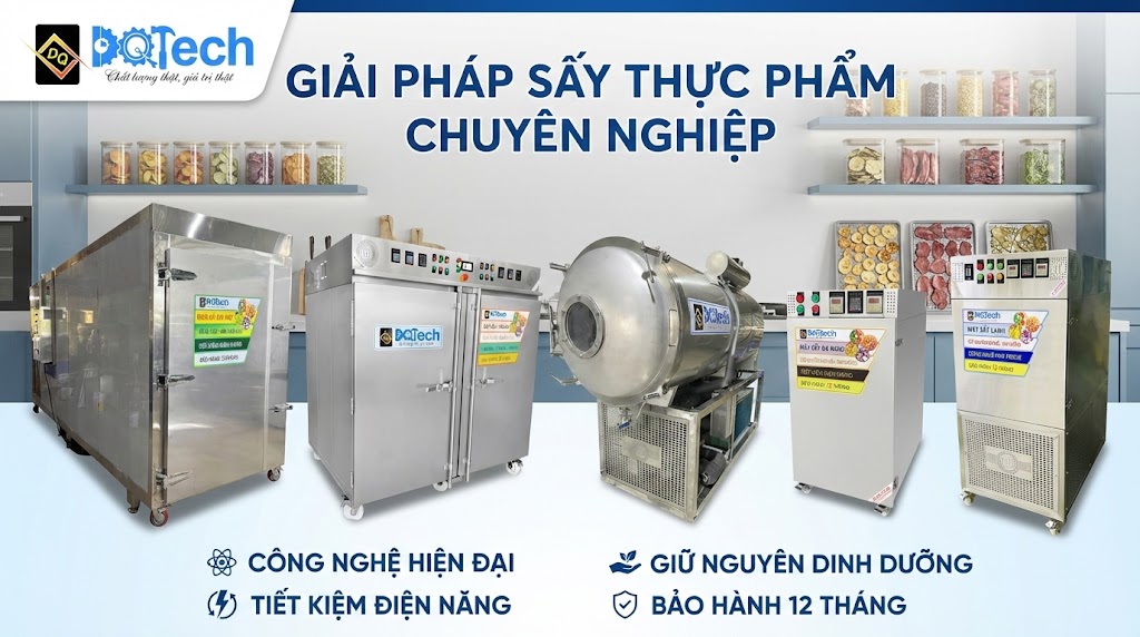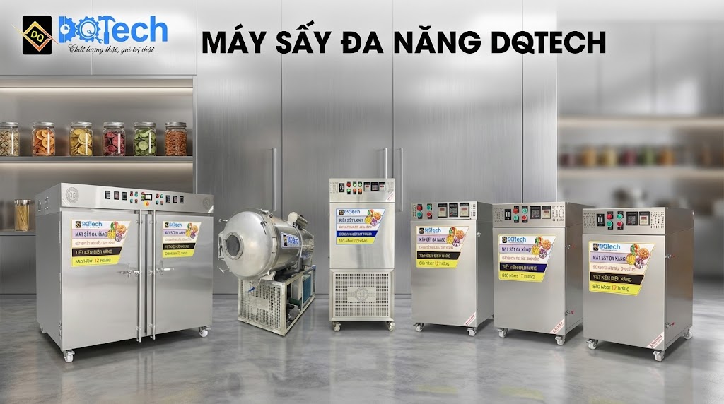 Bên cạnh đó, DQTech còn chuyên sản xuất và phân phối đa dạng các sản phẩm máy phục vụ sản xuất khác như máy ép lạnh, máy rửa rau củ quả, máy hấp, máy lọc, nồi nấu, máy in date, phụ kiện sấy, khay sấy inox,...Chúng tôi cung cấp giải pháp tủ sấy thực phẩm toàn diện dành cho khách hàng trong và ngoài nước. Những dòng máy sấy đa năng tại DQTech được sản xuất trực tiếp bởi đội ngũ DQTech, hàng Việt Nam chất lượng cao, giá cạnh tranh, đảm bảo chính sách tối ưu nhất dành cho “quý thượng đế”.Máy sấy đa năng DQTechKhác biệt với các dòng máy nhập khẩu đại trà, sản phẩm máy sấy khô thực phẩm của DQTech là kết tinh của trí tuệ Việt, được nghiên cứu và sản xuất dựa trên đặc thù nông sản nhiệt đới của Việt Nam. Chúng tôi làm chủ trọn vẹn các công nghệ sấy tiên tiến, từ sấy gió nóng tách ẩm chủ động, sấy lạnh đến sấy thăng hoa.Mỗi chiếc máy trước khi xuất xưởng đều được trải qua quy trình kiểm định khắt khe với tiêu chuẩn vật liệu 100% inox 304 cao cấp, đảm bảo vệ sinh an toàn thực phẩm, tuổi thọ vận hành bền bỉ theo thời gian.Đặc biệt, tại DQTech, chúng tôi không chỉ bán máy, hơn cả, chúng tôi chuyển giao công nghệ sấy miễn phí cho khách hàng. Đội ngũ kỹ sư DQTech luôn sẵn sàng đồng hành, tư vấn công thức sấy riêng biệt cho từng loại nguyên liệu sấy như máy sấy mít, máy sấy sầu riêng, máy sấy yến sào,... giúp khách hàng tối ưu hóa quy trình và nâng cao lợi nhuận từ mẻ sấy đầu tiên.