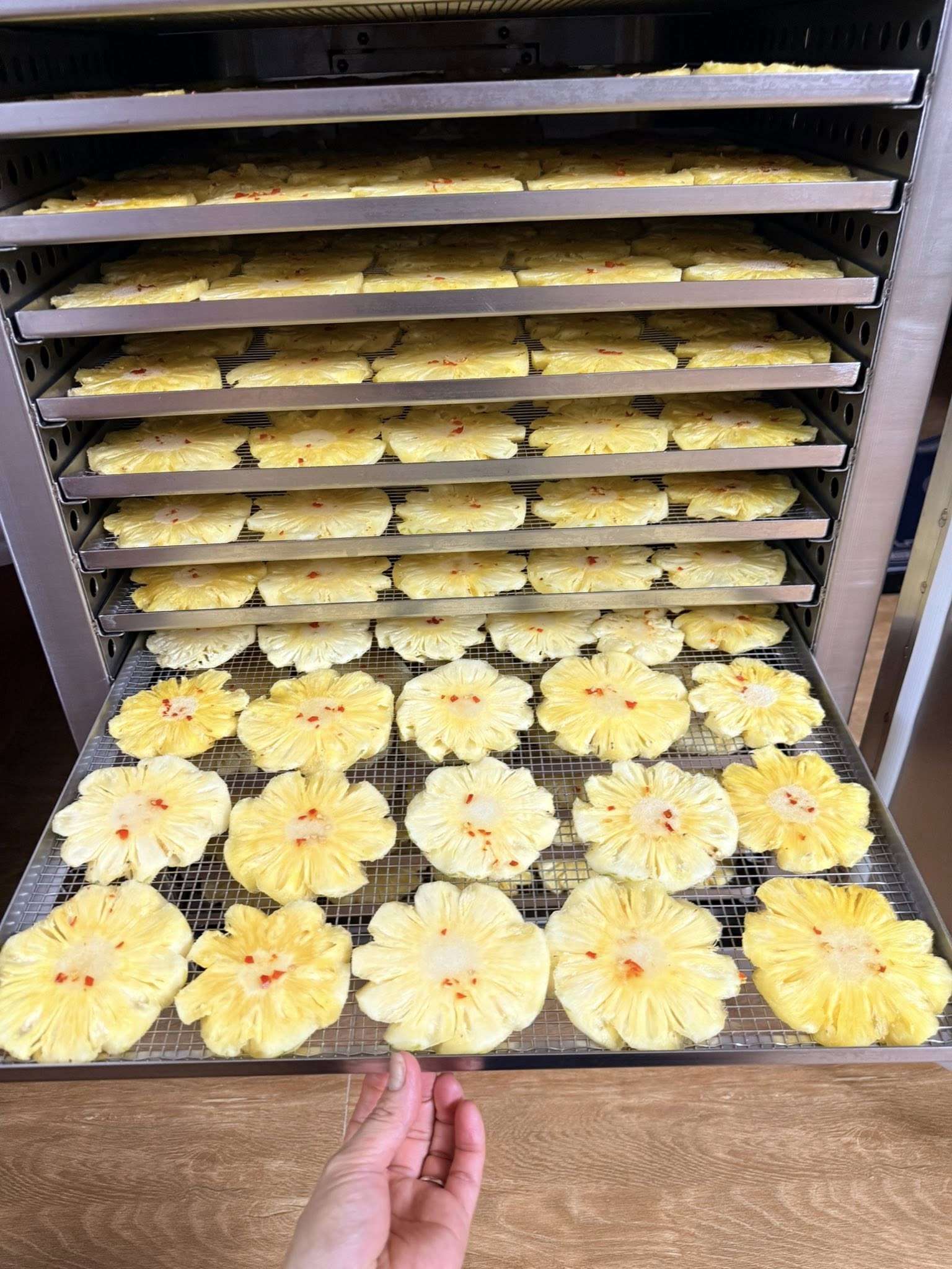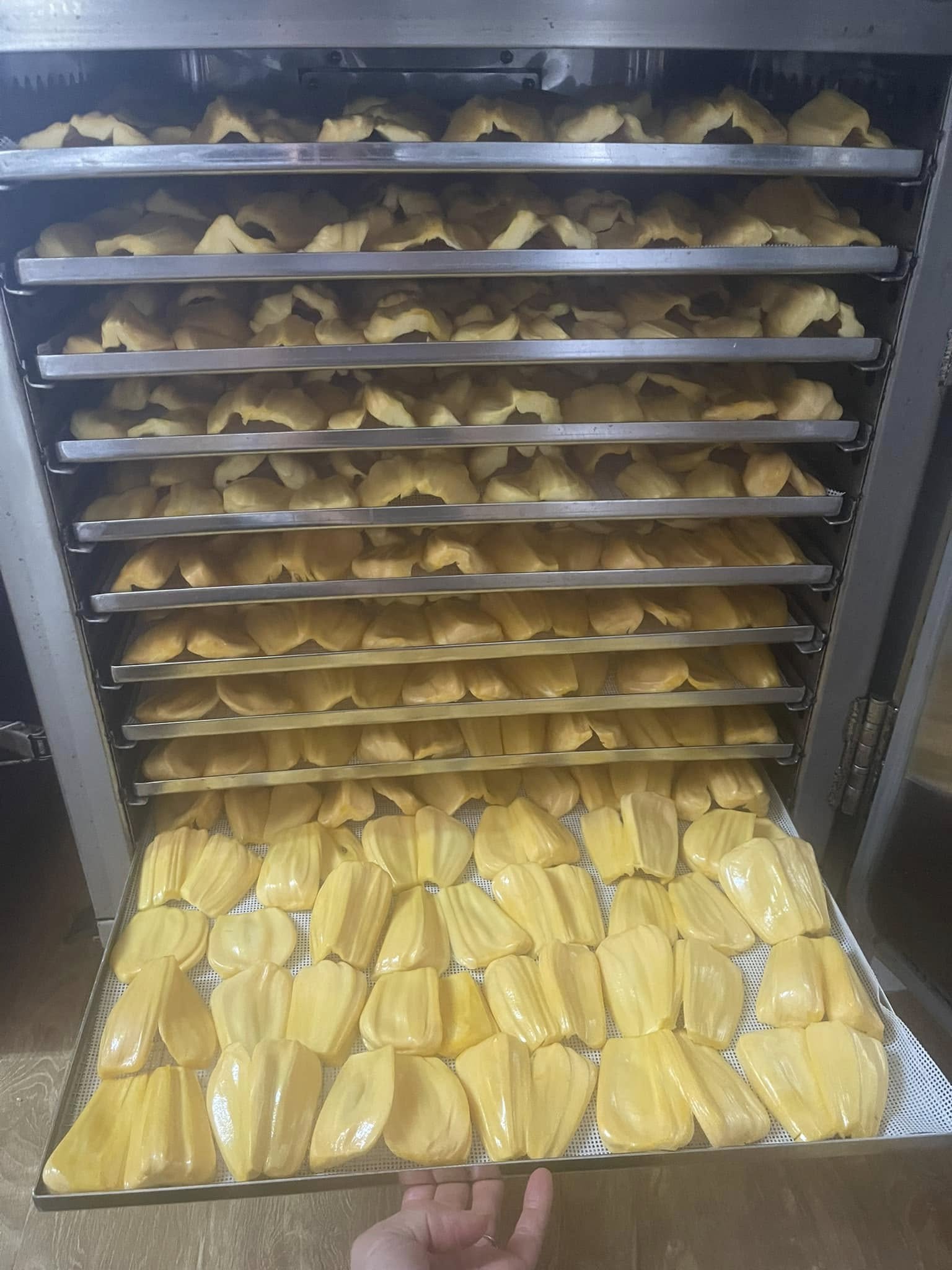 Bạn cần xếp nguyên liệu dàn đều trên khay sấy inox, tuyệt đối không được xếp chồng lên nhau, giúp thực phẩm sấy được khô đều, nhanh và hiệu quả hơn.