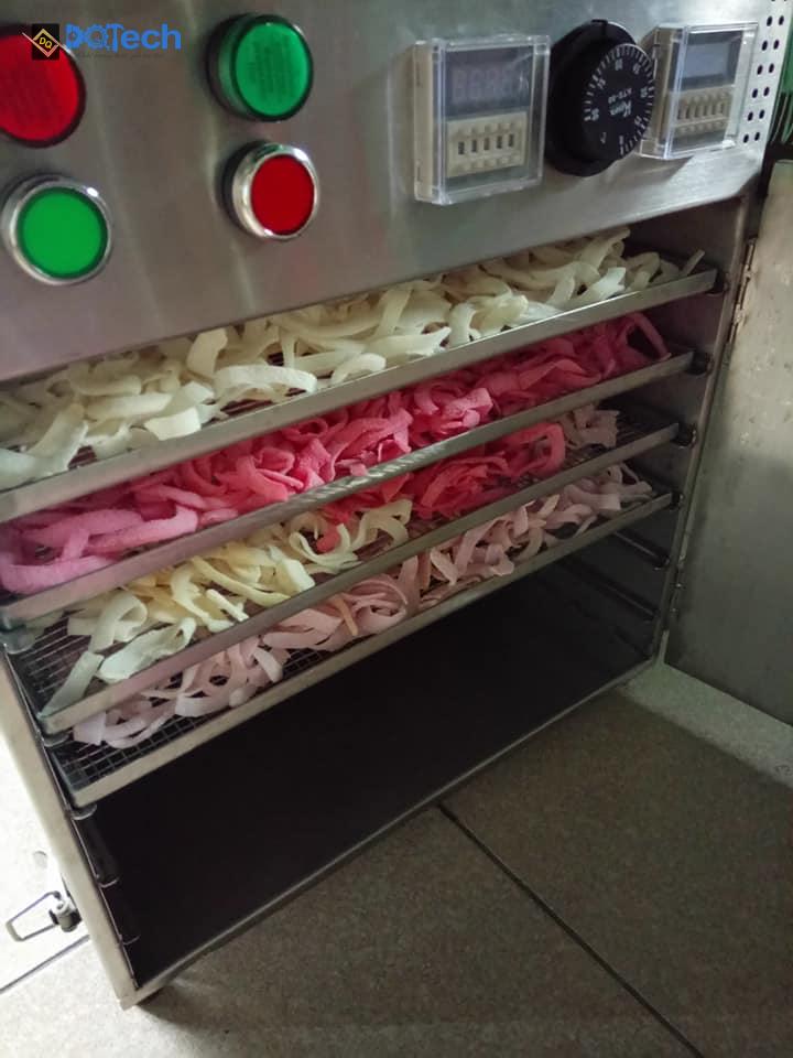 Bước 4: Tiến hành sấy khô mứt dừa bằng tủ sấy thực phẩm. Bạn cho phần dừa đã nấu vào từng khay sấy inox, cài đặt các thông số về nhiệt độ sấy, thời gian sấy, tách ẩm phù hợp. Trong quá trình sấy, bạn có thể mở tủ sấy và theo dõi, kiểm tra chất lượng sản phẩm. Với máy sấy đa năng hãng DQTech, bạn không e ngại vấn đề nóng mặt bởi máy sấy được ứng dụng công nghệ gió cuốn vào trong.